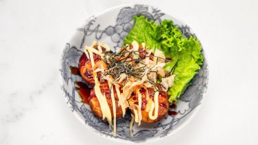 Battered octopus fried to perfection. Topped with bonito flakes, okonomiyaki sauce, Japanese QP mayo, and shredded nori