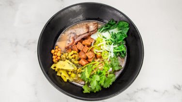 A delicious light and mild spicy pork broth with tender bite-sized pork short-ribs. Topped with crunchy bean sprouts, sour cabbage, soya beans and green onions.