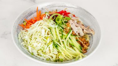 Great match for hot Summer! Tasty and refreshing cool noodle, topped with shredded cucumber, carrot, bean sprout, cabbage, and peanuts.
