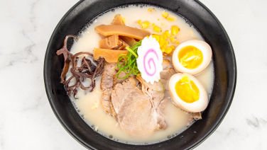 Tonkotsu flavoured ramen with chasu, marinated bamboo, sweet corn, garlic chips, red benishoga ginger, shredded green onions, and drizzled with black garlic oil.